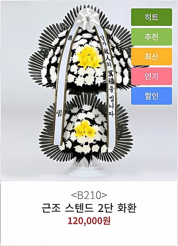 - 구성: 세 단으로 구성된 꽃 장식, 상단은 국화나 백합 등 조화를 사용.