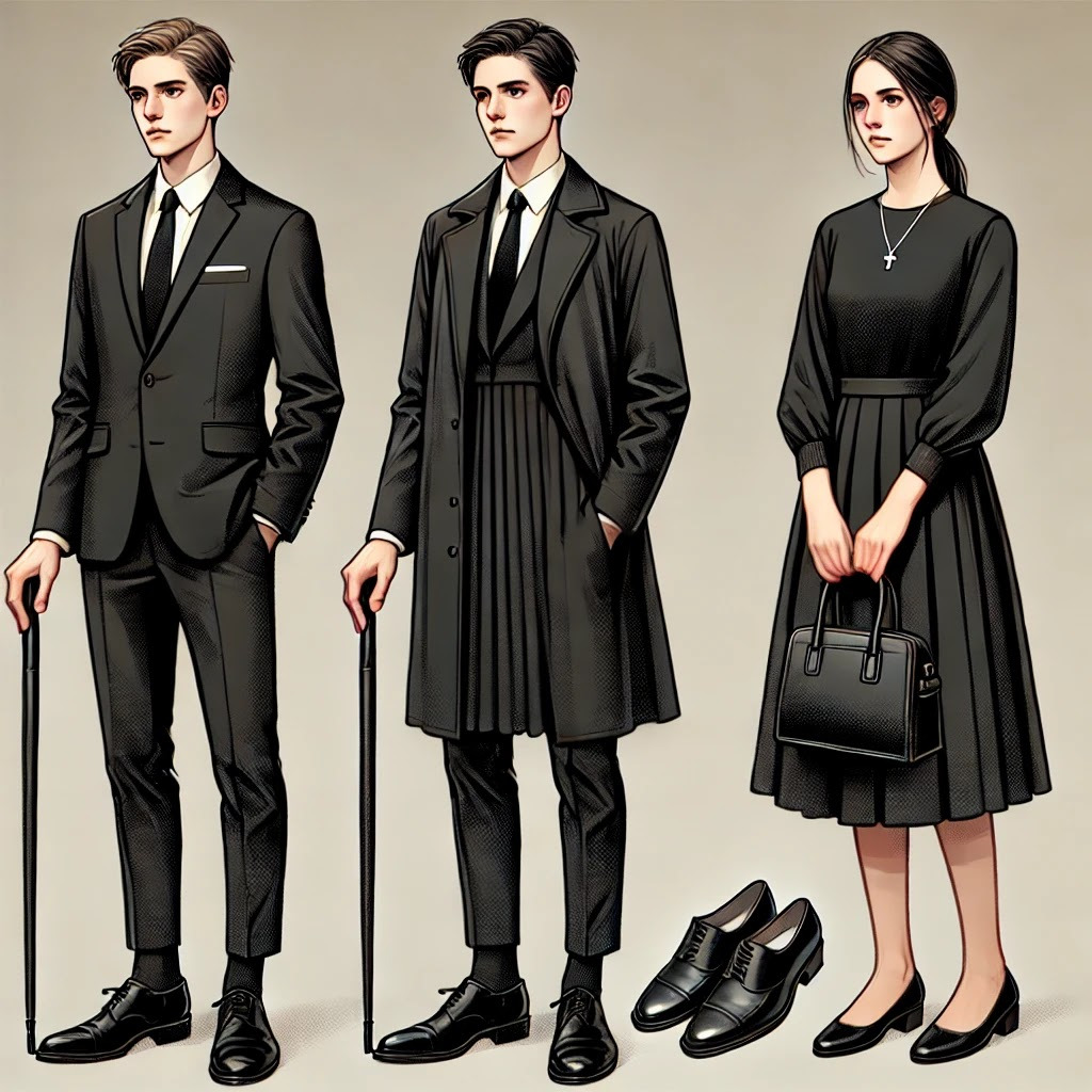- 남성은 어두운 양복과 흰 셔츠, 검은 넥타이가 적절하며, 여성은 화려하지 않은 검은 정장이나 단정한 원피스를 착용합니다.